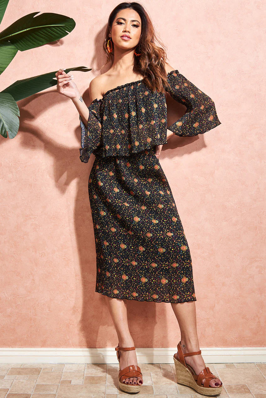 OFF SHOULDER ASYMMETRIC PLEATED WAIST MAXI DRESS