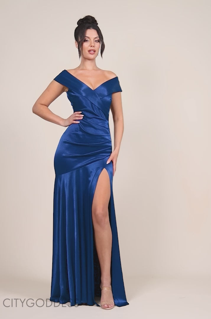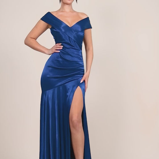 SATIN OFF SHOULDER PLEATED MAXI DRESS